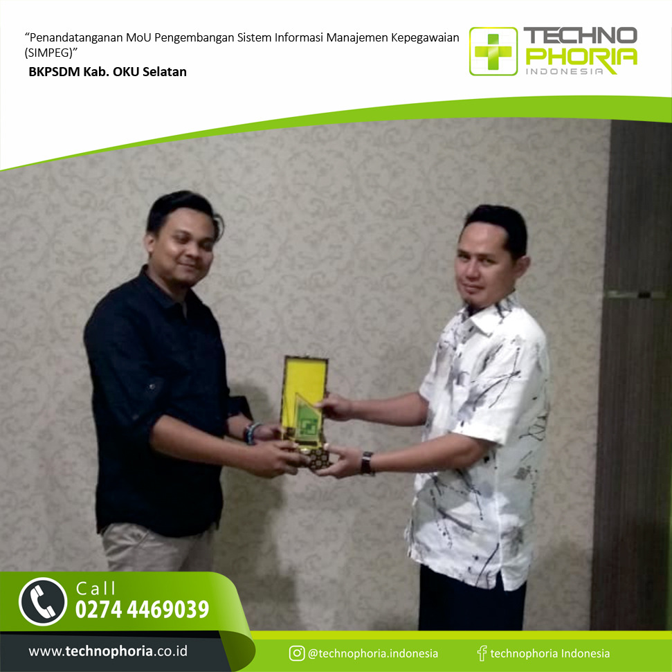 Muaradua- Technophoria Indonesia melakukan penandatanganan Memorandum of Understanding (MoU) dengan Badan Kepegawaian dan Pengembangan Sumber Daya Manusia (BKPSDM) Kabupaten Ogan Komering Ulu Selatan. Penandatanganan MoU tentang kerjasama pemgembangan Sistem Informasi Manajemen Kepegawaian (SIMPEG) ini dilaksanakan minggu lalu dan dilakukan oleh Direktur Utama Technophoria Indonesia Agung Y Nugroho dan Kepala BKPSDM Kabupaten OKU Selatan, Eva Nirwana S.IP., MM serta disaksikan oleh jajaran manajemen dan staf Technophoria Indonesia dan BKPSDM Oku Selatan.
